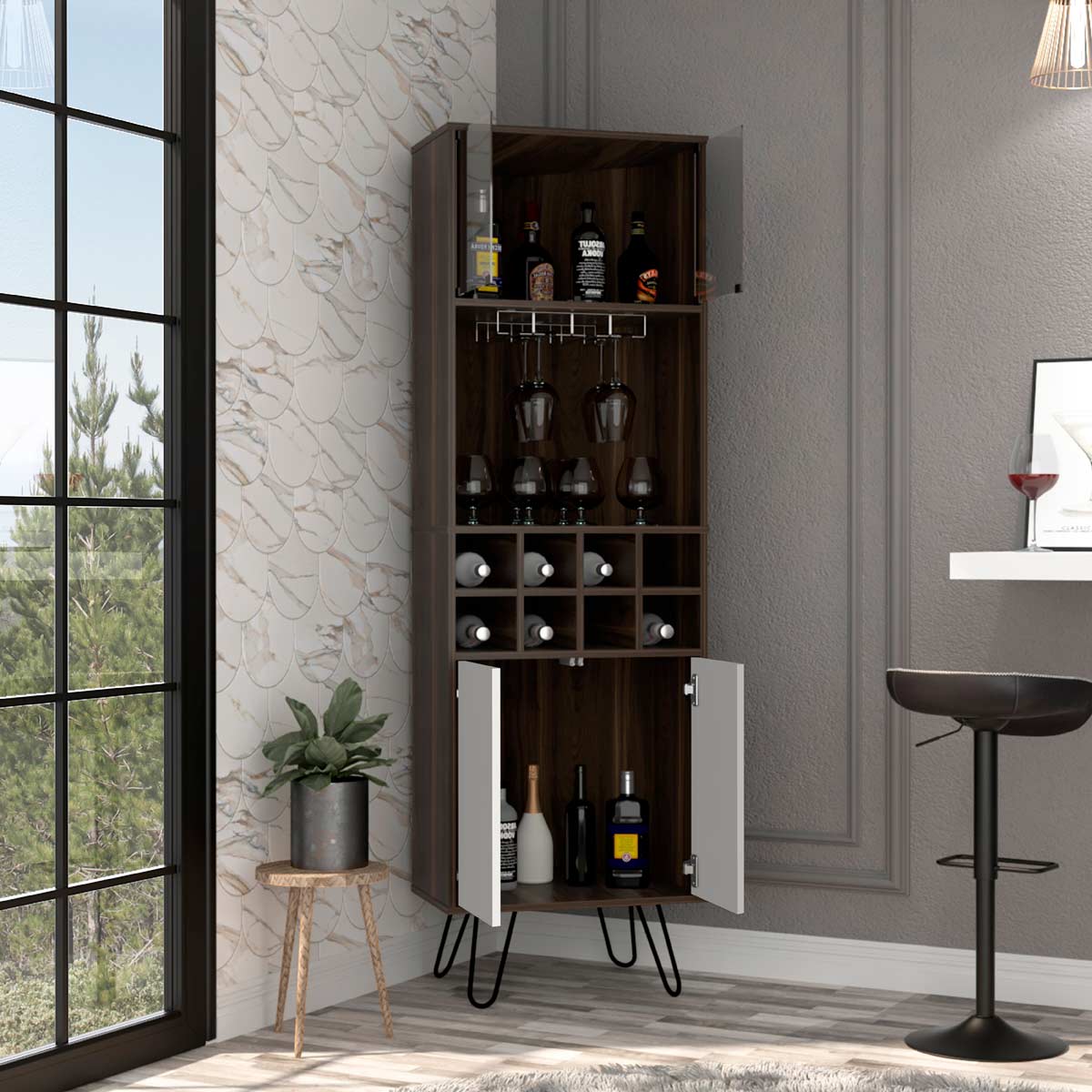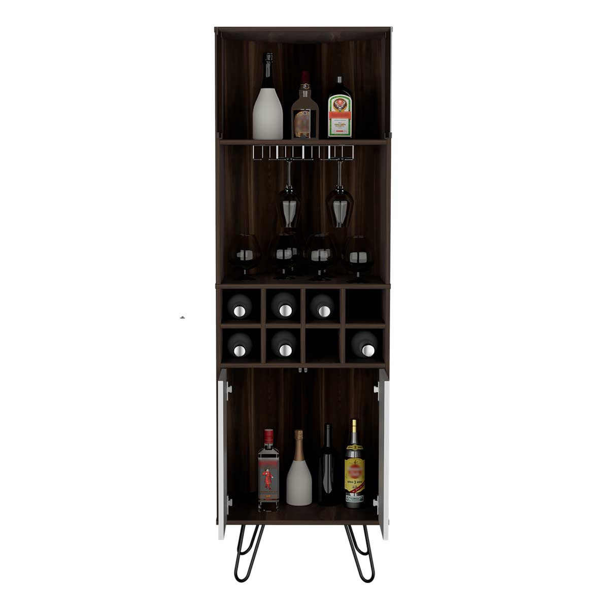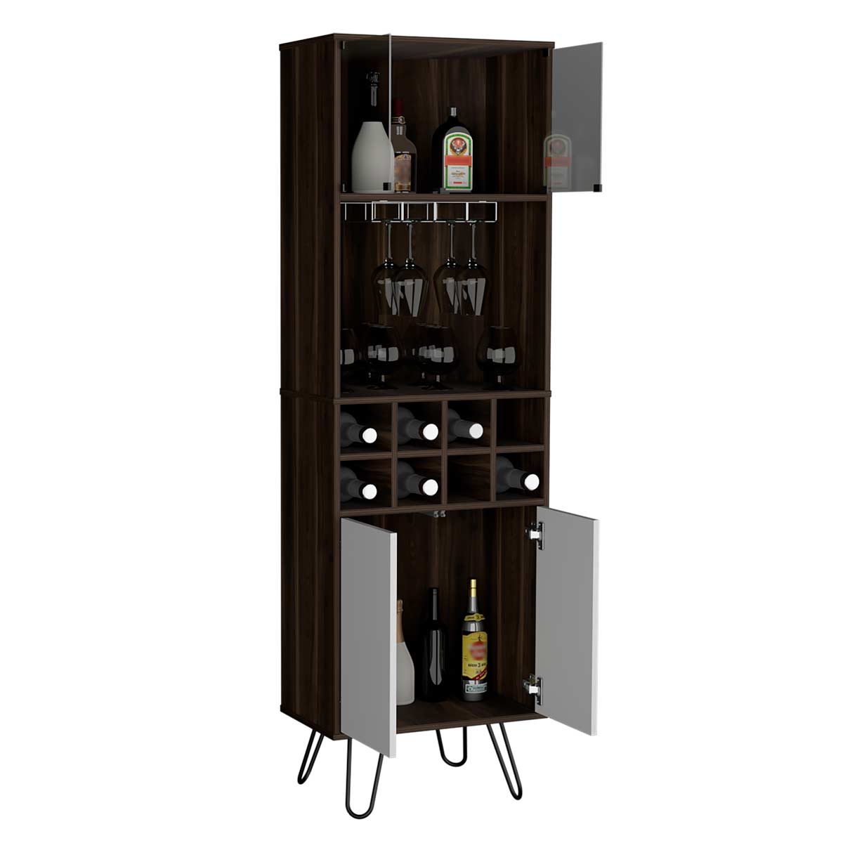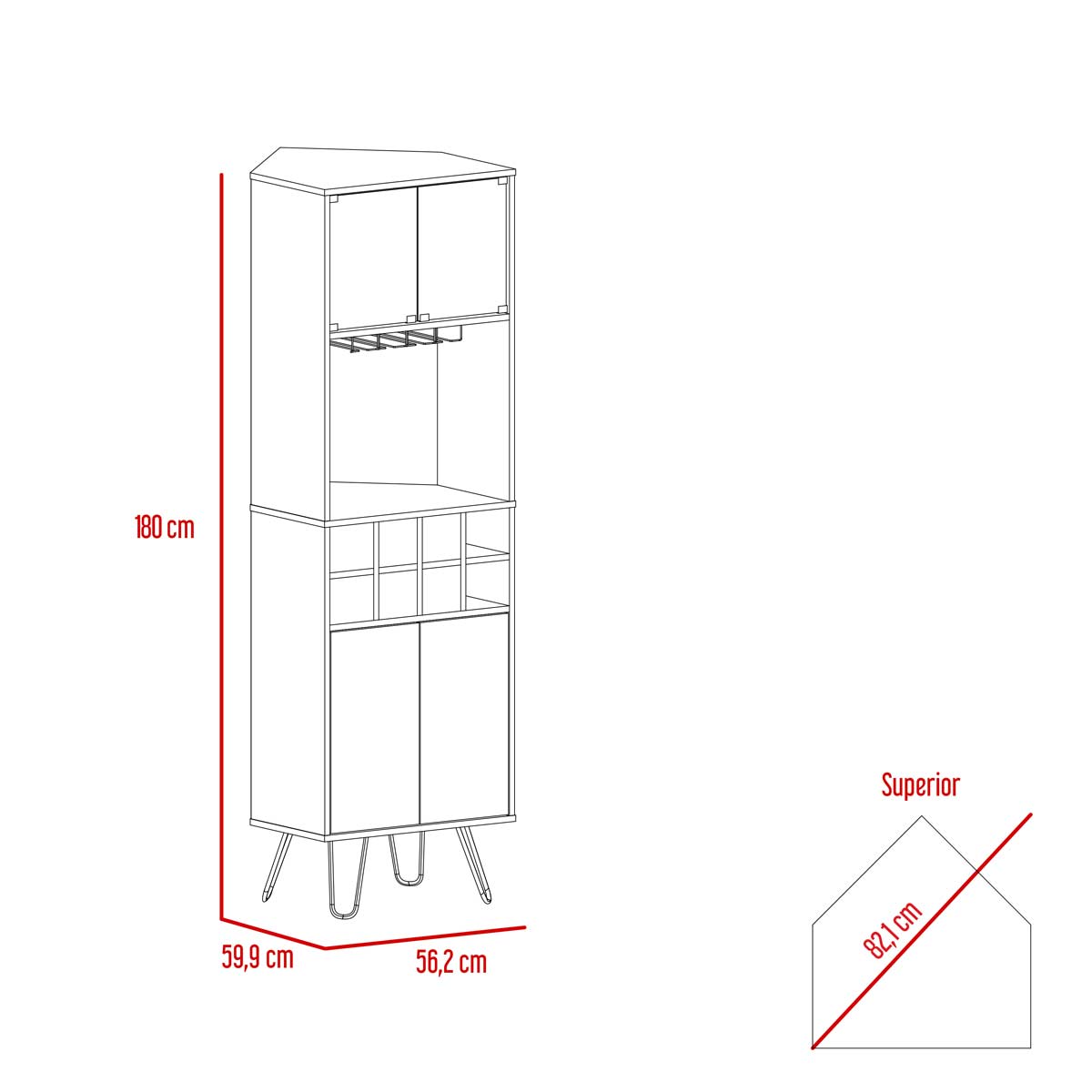 Espacio para botellas de vino y portacopasPuertas de vidrioDos puertas abatibles con sistema de apertura pushPatas metálicas negras