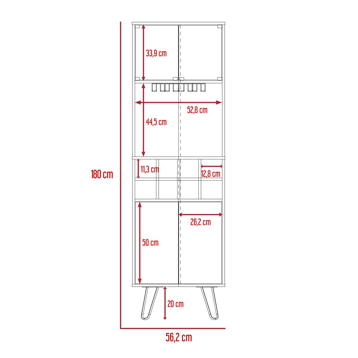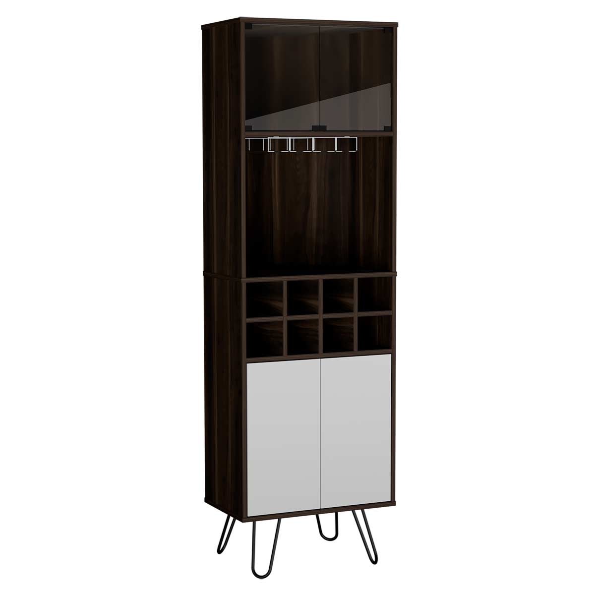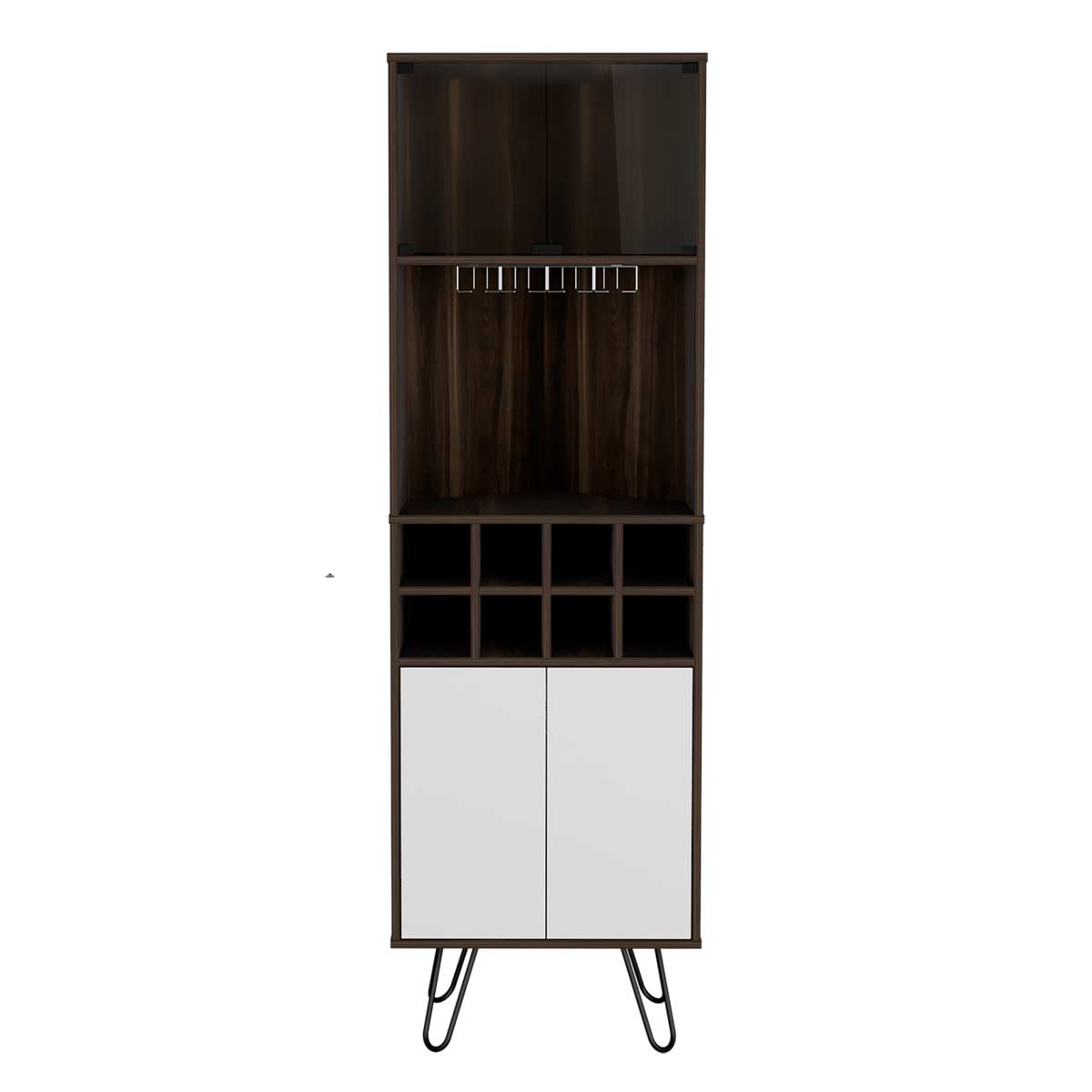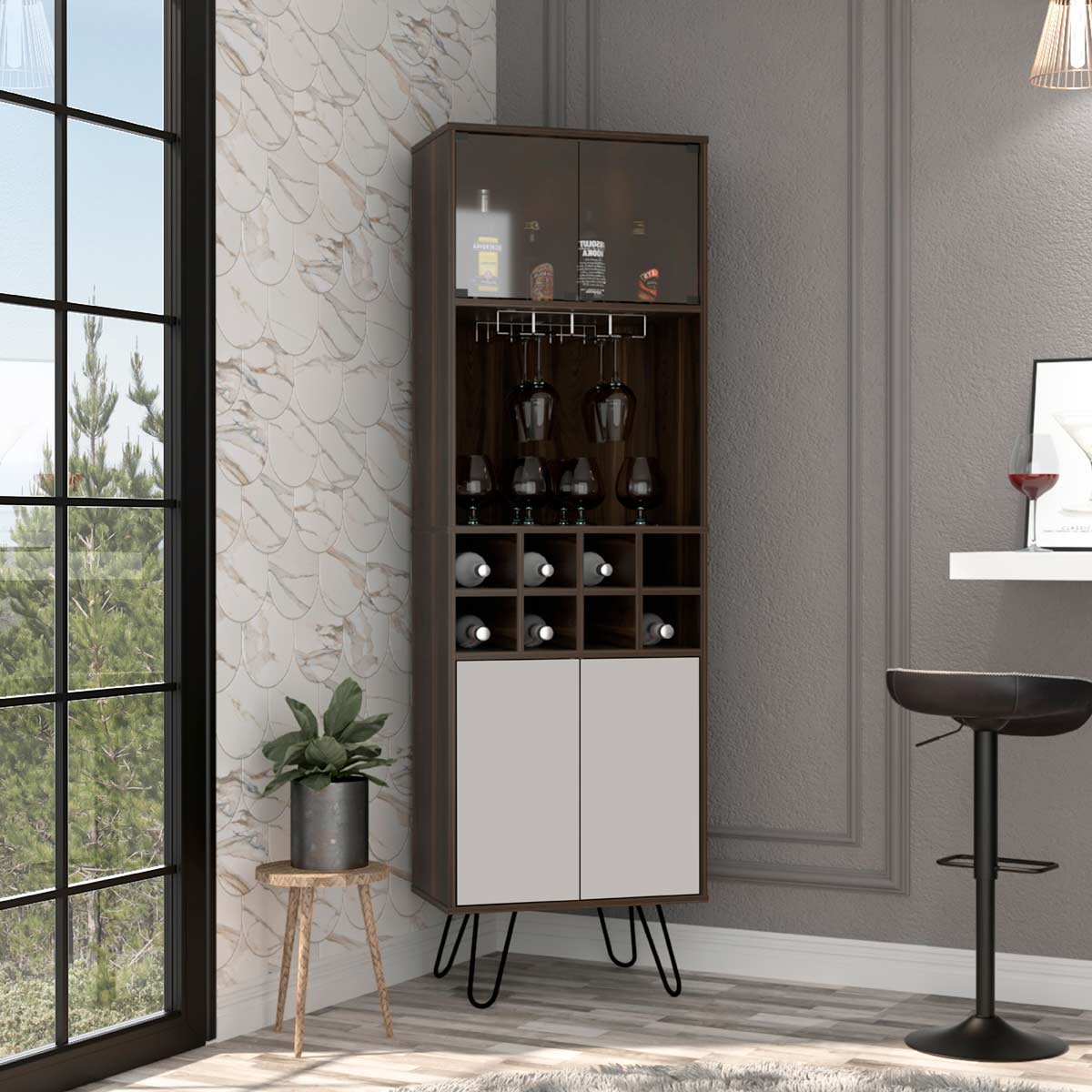 Espacio para botellas de vino y portacopasPuertas de vidrioDos puertas abatibles con sistema de apertura pushPatas metálicas negras