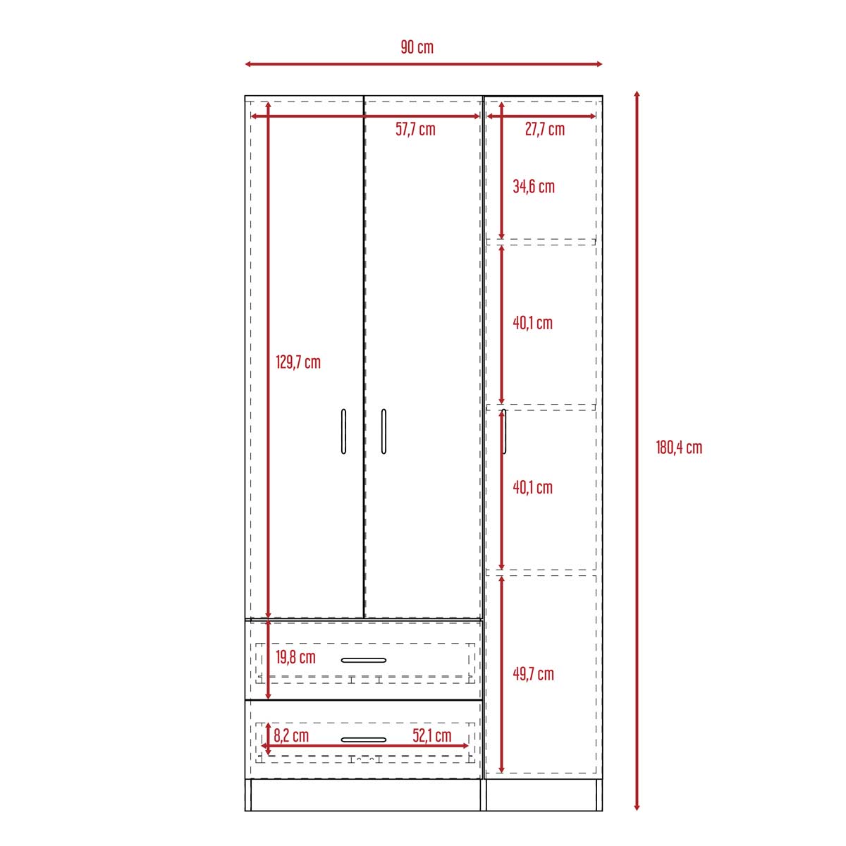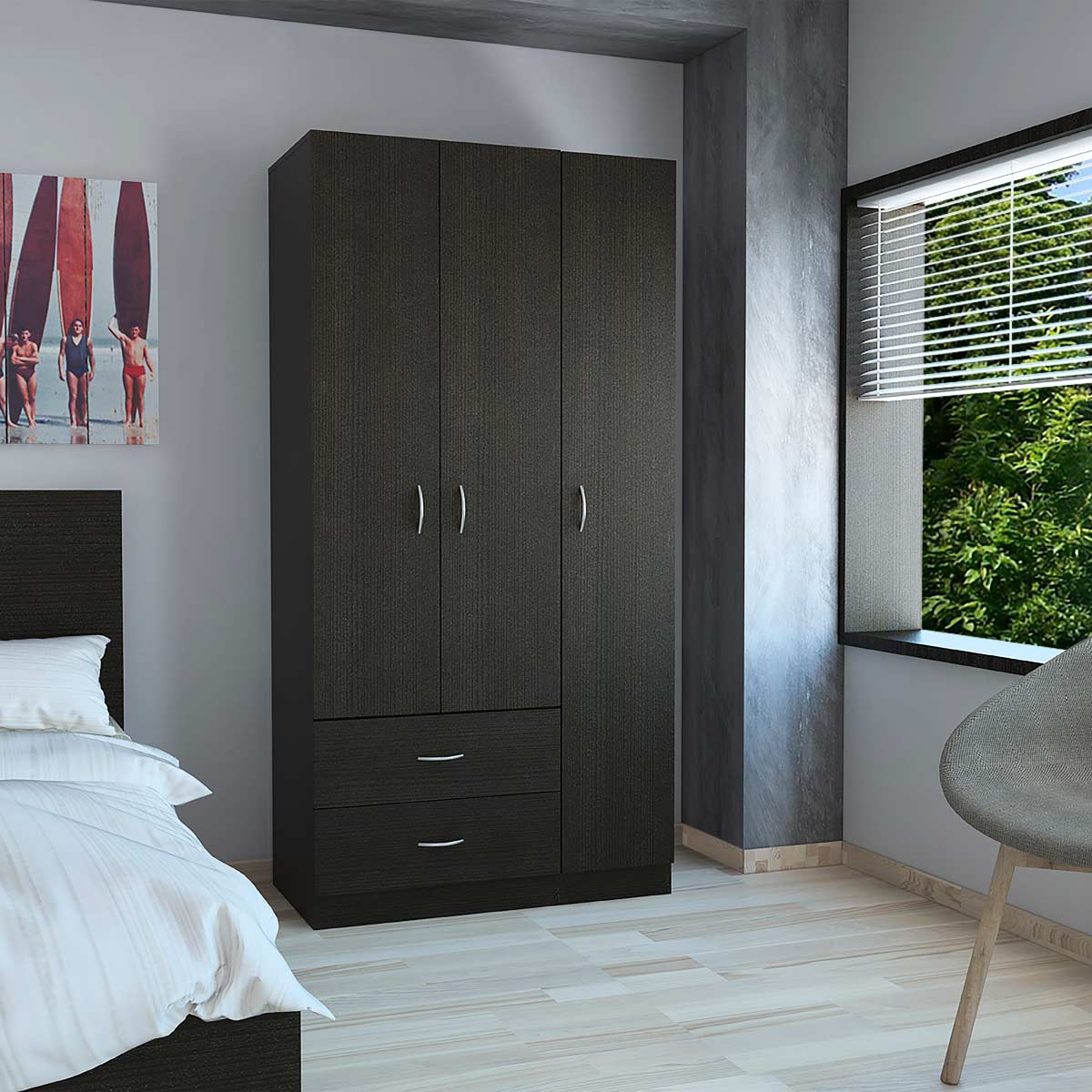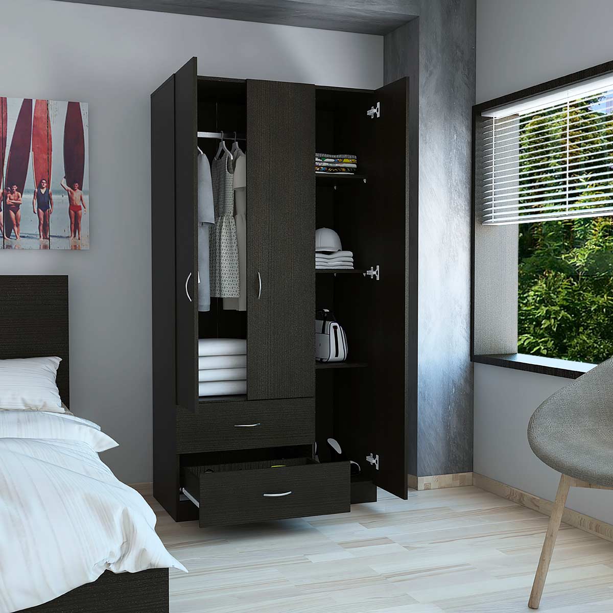Tubo para colgar la ropaEntre paños para ubicar ropa, zapatos y accesoriosDos cajones con gran capacidad de almacenamientoManijas metálicas