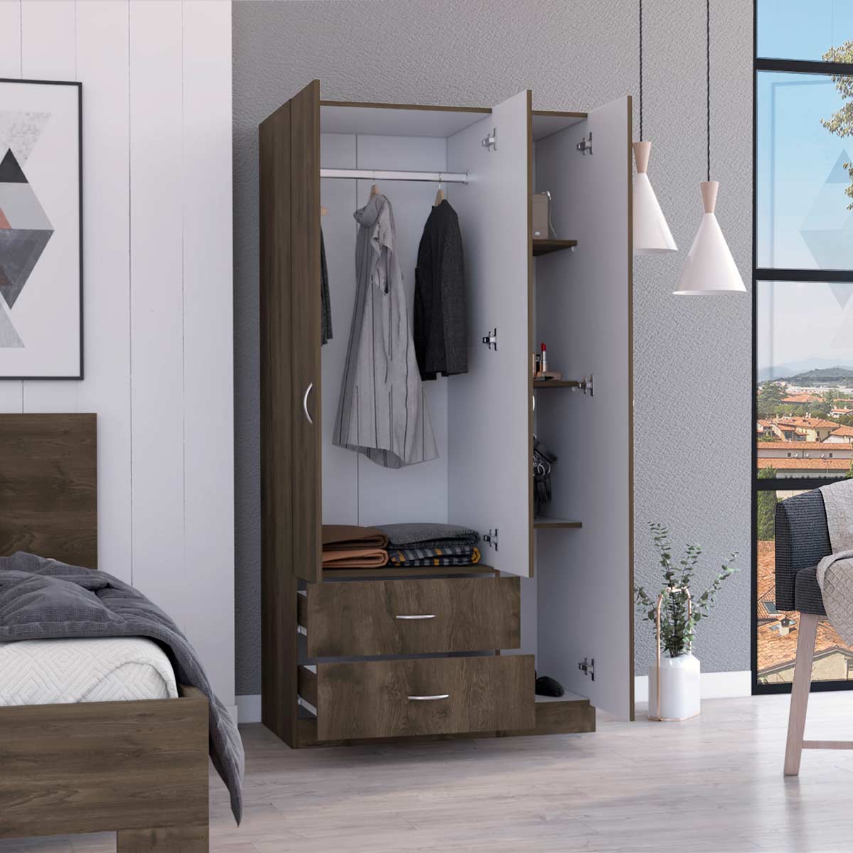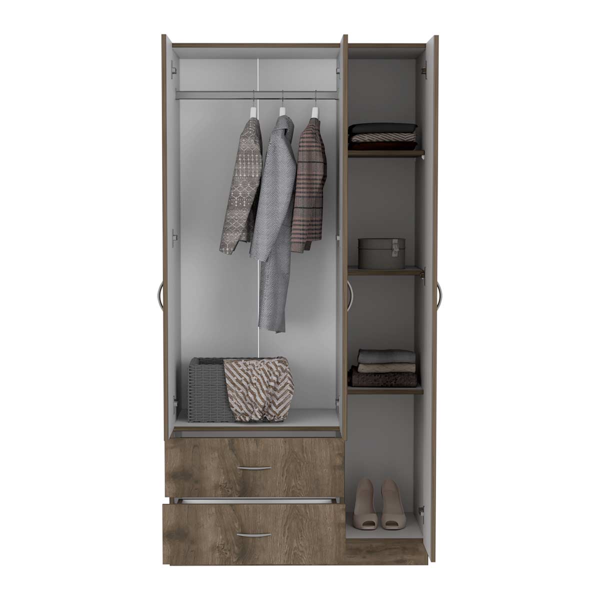 Tubo para colgar la ropaEntre paños para ubicar ropa, zapatos y accesoriosDos cajones con gran capacidad de almacenamientoManijas metálicas