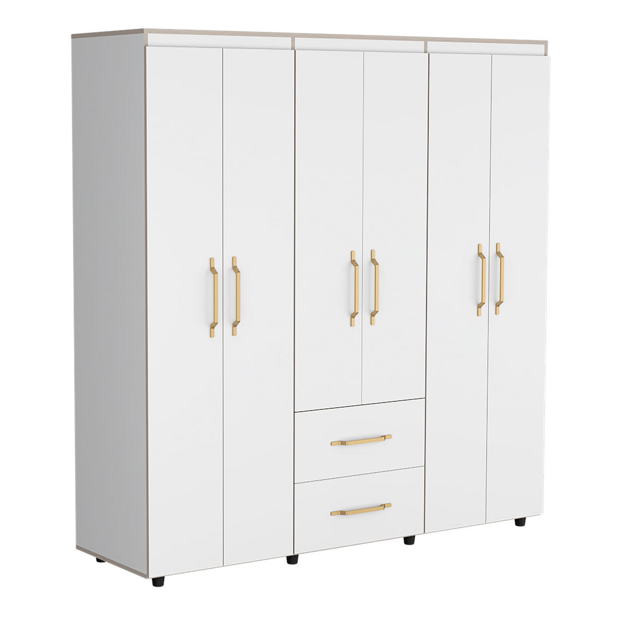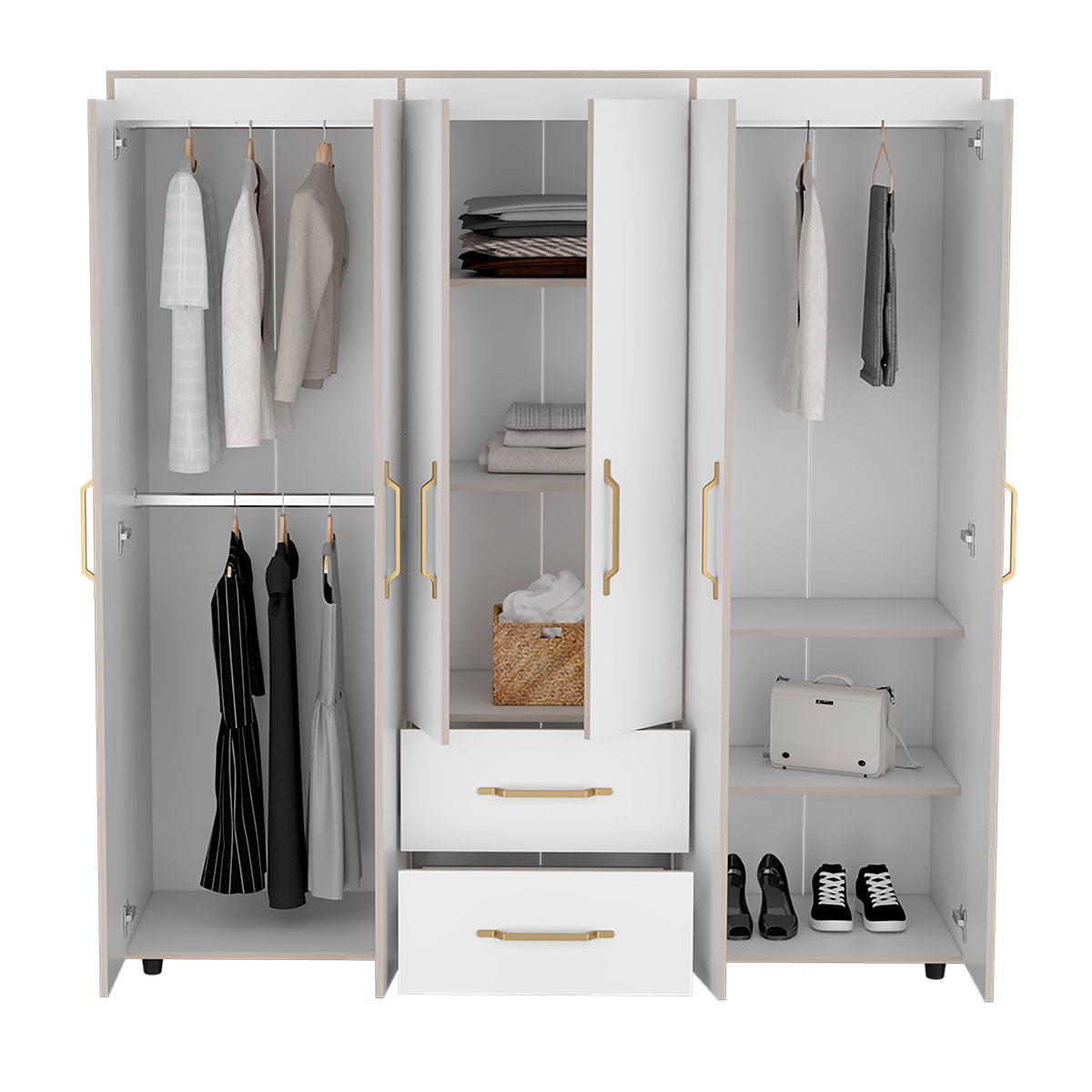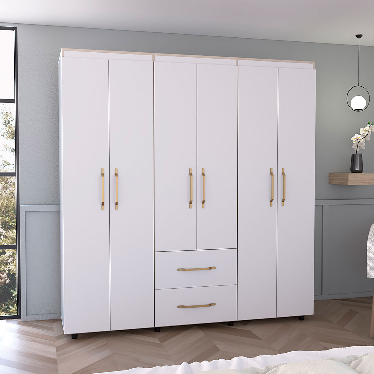 Amplios espacios de almacenamiento para organizarSeis puertas batientesTres tubos cromados para colgar la ropaDos cajones organizadoresManijas doradasDeslizadores plásticos para apoyar al pisoCanto con textura natural
