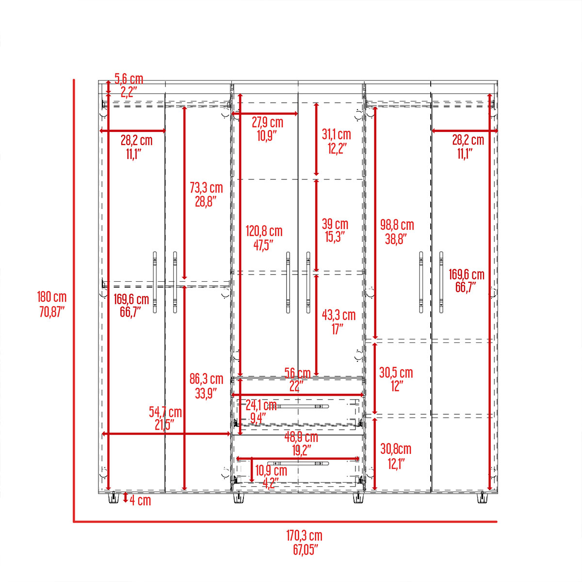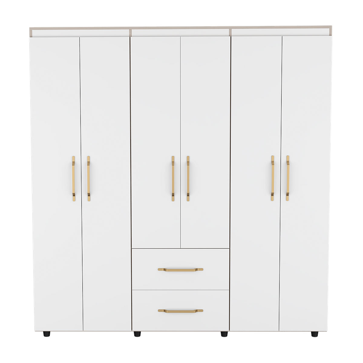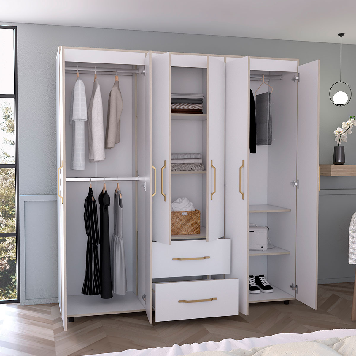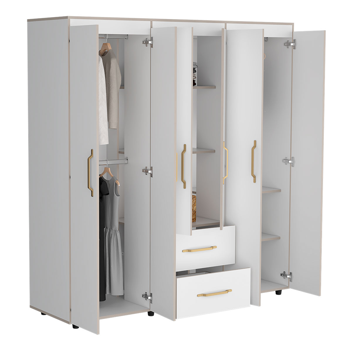 Amplios espacios de almacenamiento para organizarSeis puertas batientesTres tubos cromados para colgar la ropaDos cajones organizadoresManijas doradasDeslizadores plásticos para apoyar al pisoCanto con textura natural