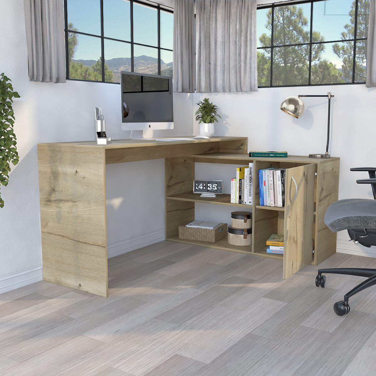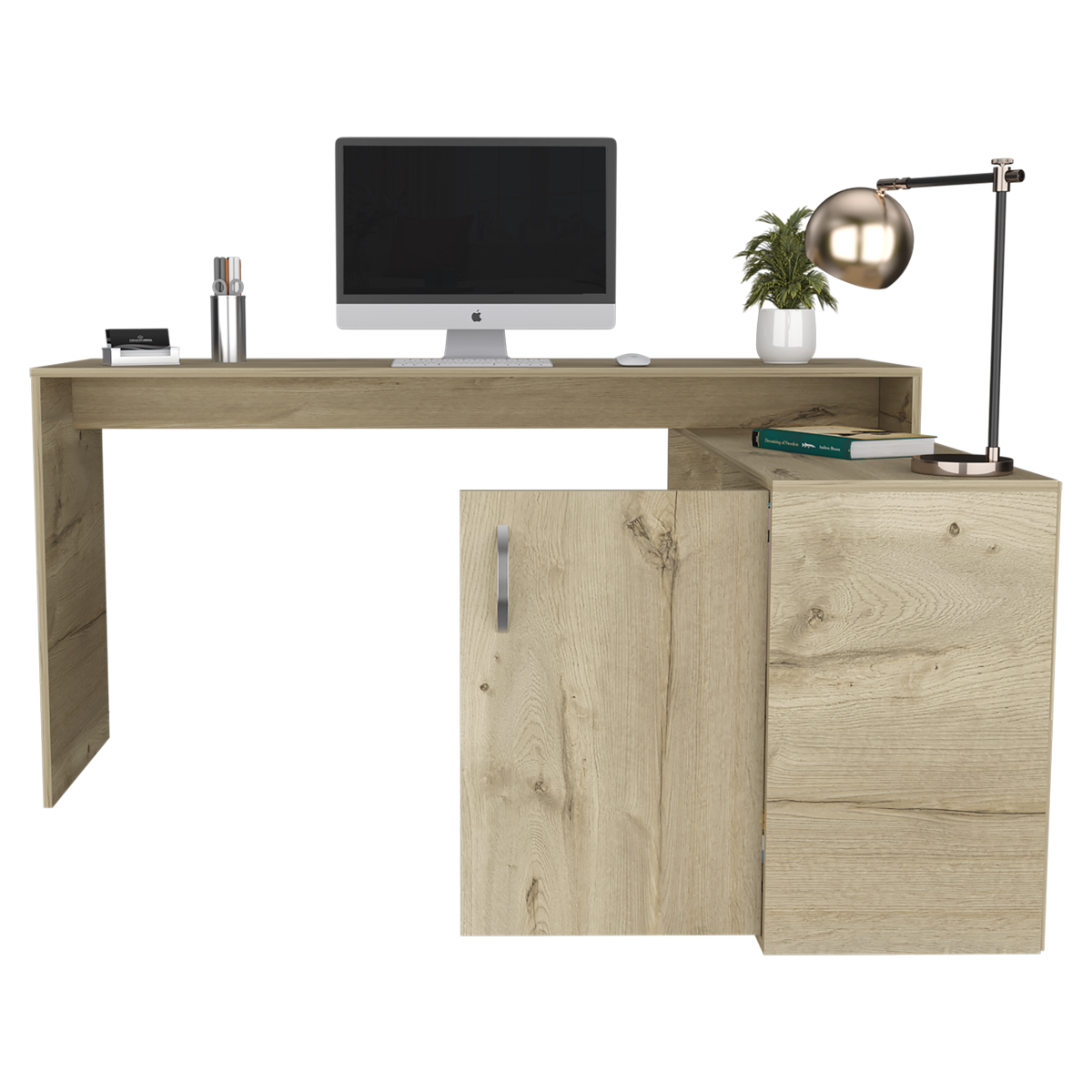 Amplia superficie de trabajoEspacio con puerta batiente para almacenar objetos de estudioEntre paño abierto para ubicar elementos decorativos y de estudio
