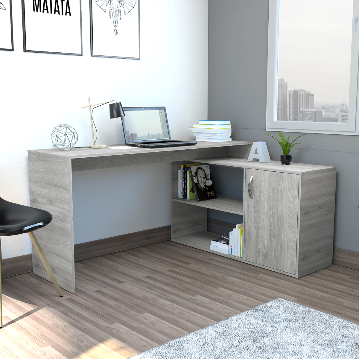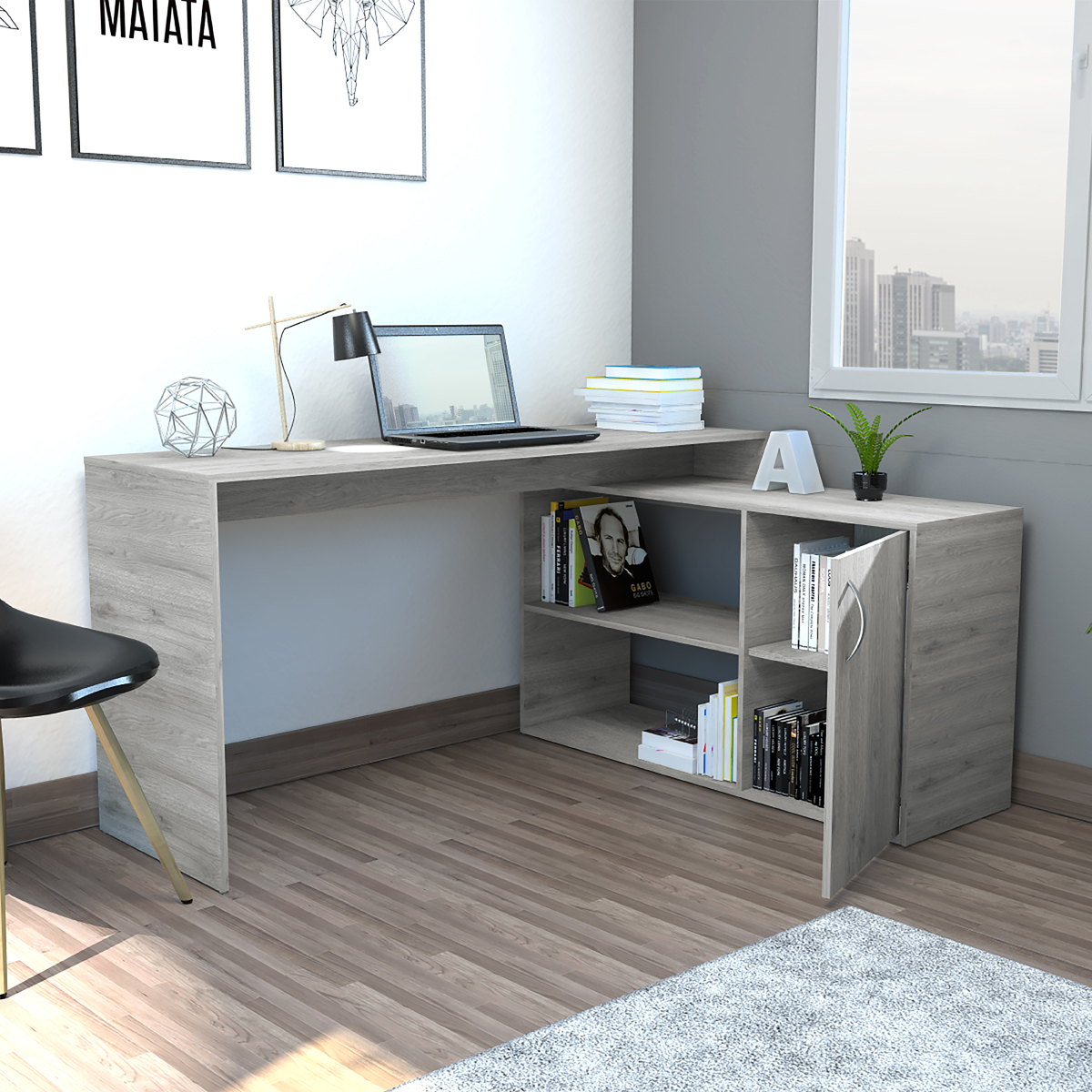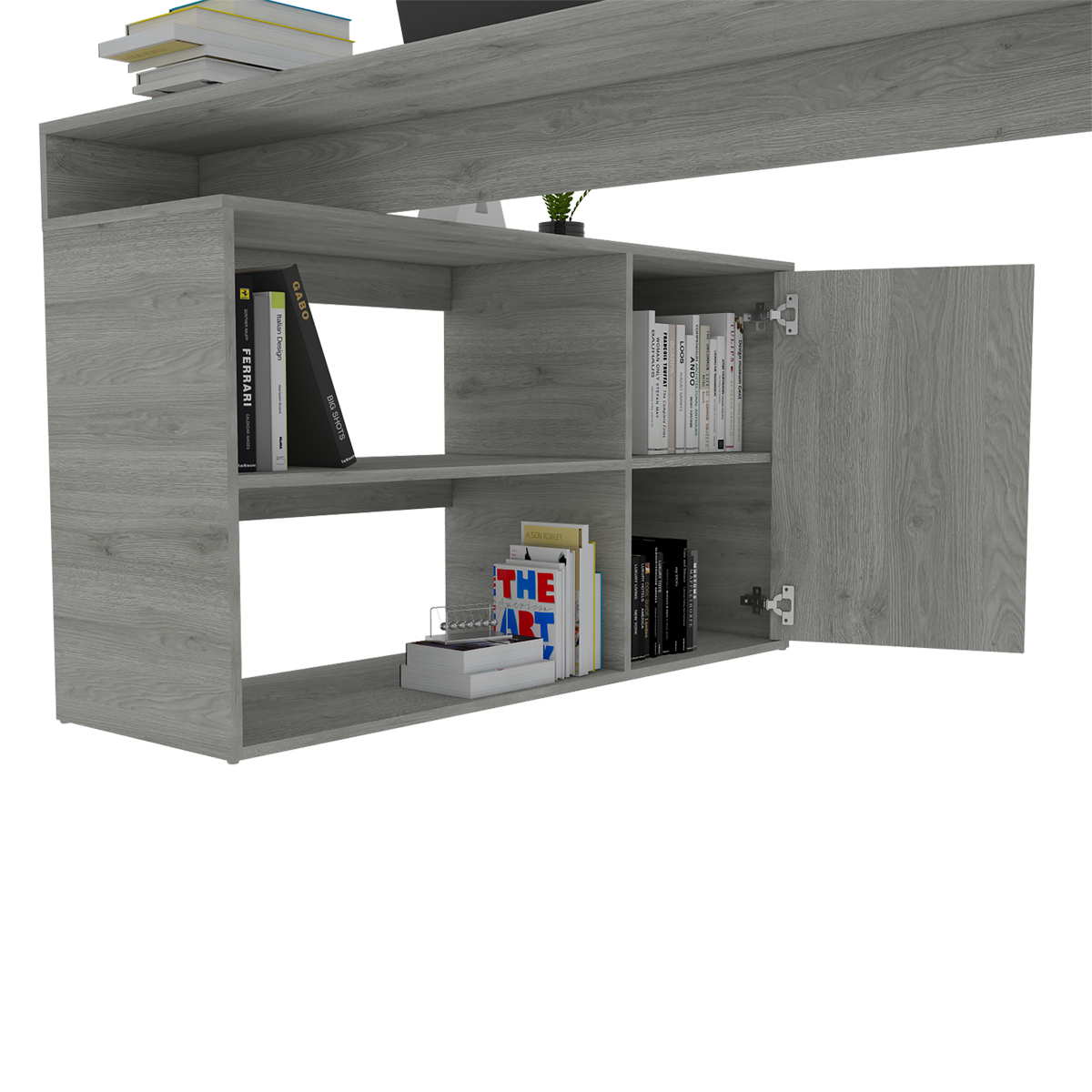 Amplia superficie de trabajoEspacio con puerta batiente para almacenar objetos de estudioEntre paño abierto para ubicar elementos decorativos y de estudio