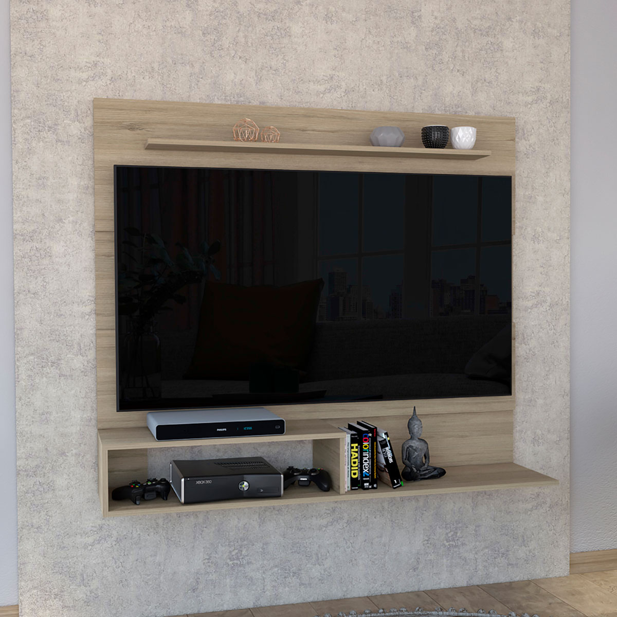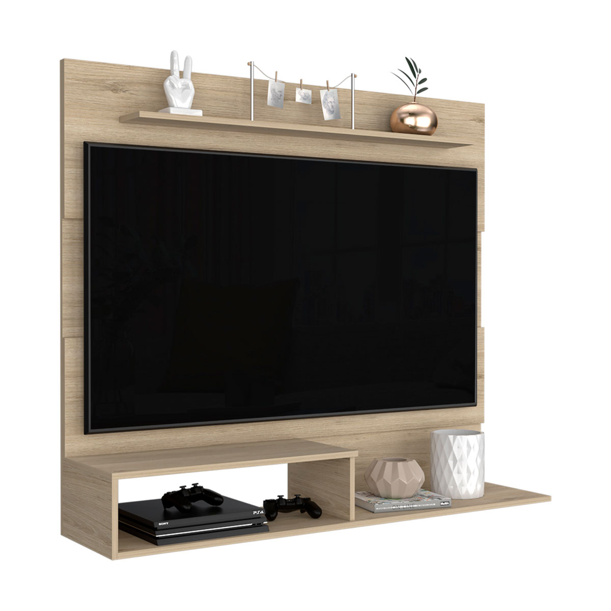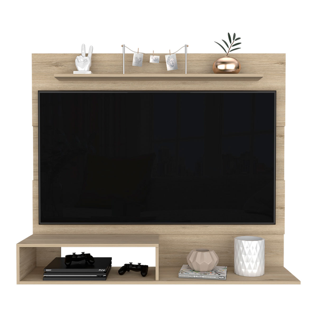 Múltiples entrepaños y superficies para ubicar objetos tecnológicos y de decoración