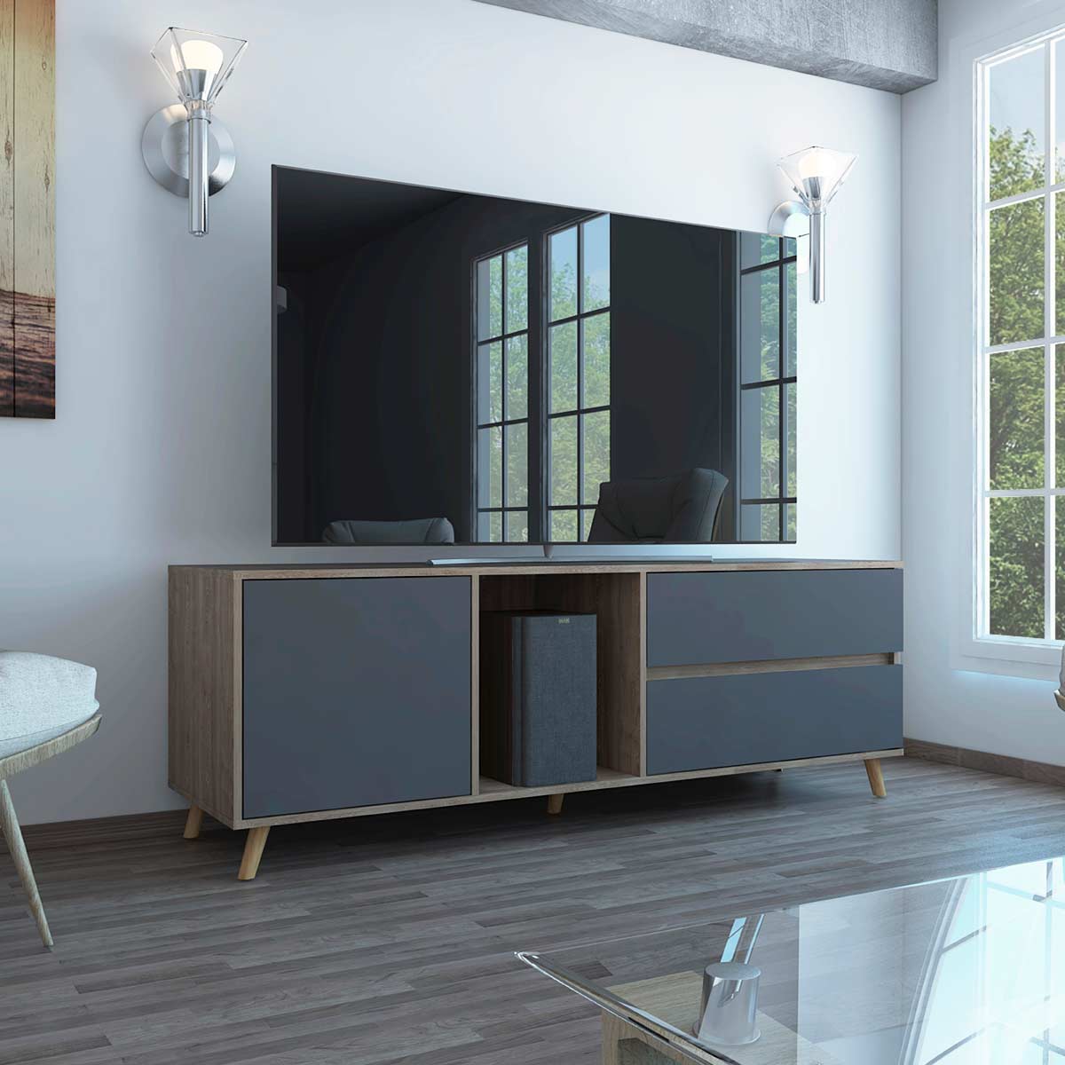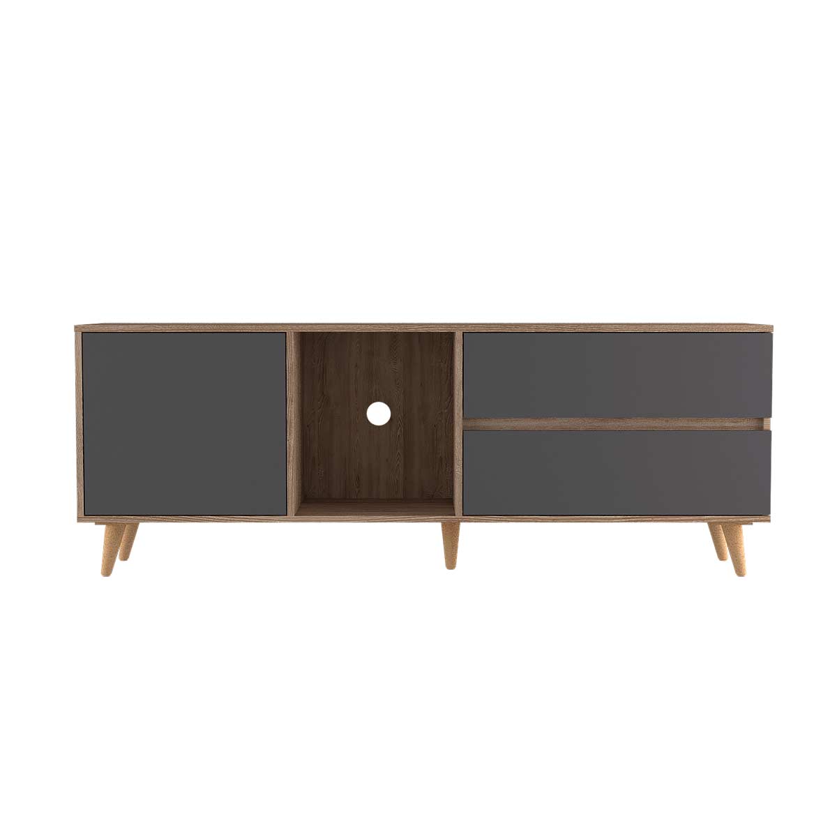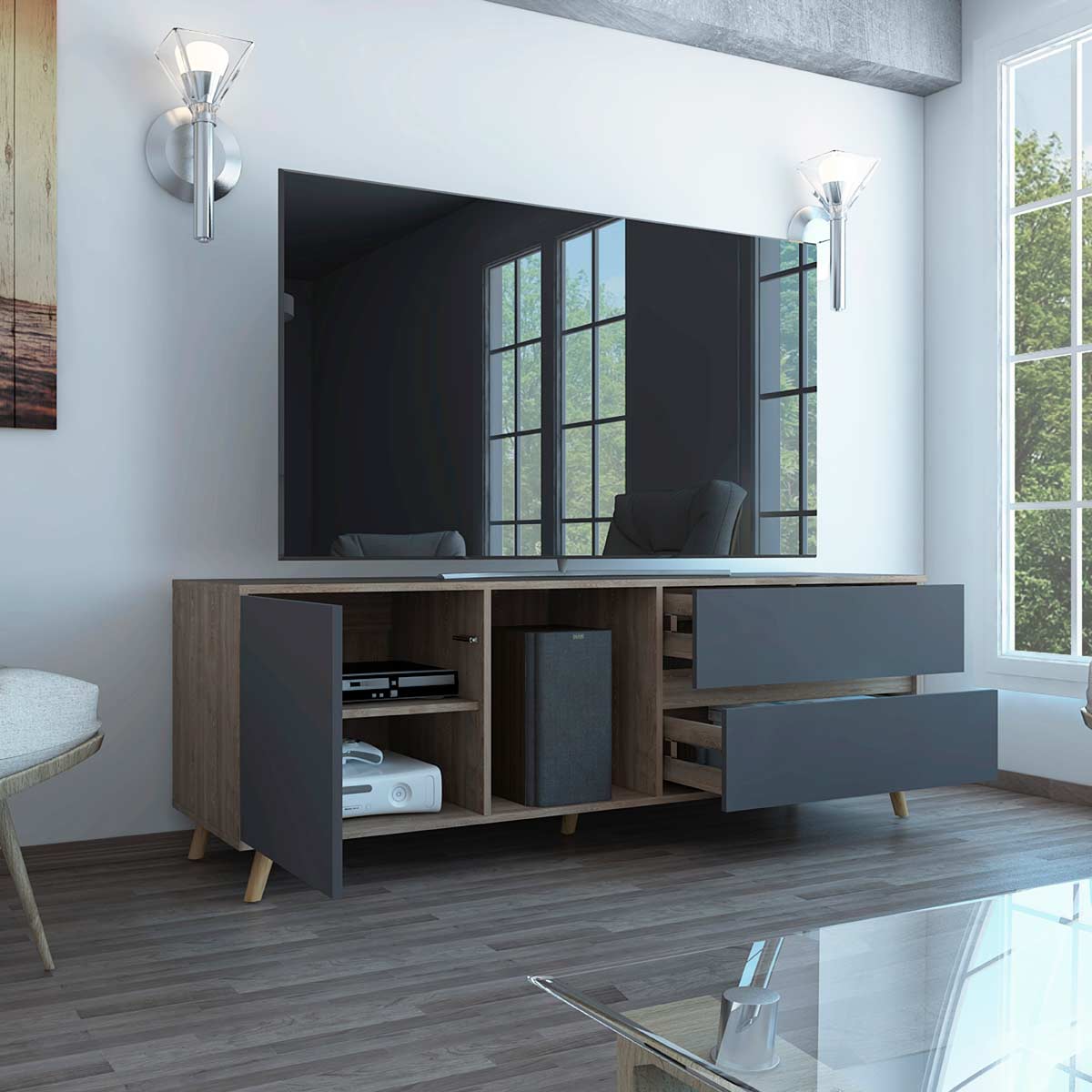 Una puerta abatible y dos cajones con espacio para ubicar objetos de audio y video